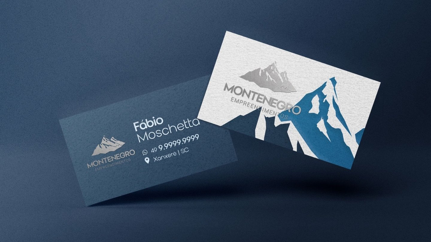 O elemento visual central é a representação de uma montanha, estilizada de forma moderna e com uma paleta de cores que evoca solidez e confiança – o azul em tons que remetem à estabilidade e o cinza/grafite que sugere sofisticação e profissionalismo. A montanha, por si só, é um arquétipo poderoso, simbolizando ambição, solidez, durabilidade e a conquista de objetivos elevados, o que se alinha bem com o setor de empreendimentos. A tipografia escolhida para "MONTENEGRO" é robusta e com letras maiúsculas, transmitindo força e presença. A cor escura reforça essa sensação de solidez. Já a palavra "EMPREENDIMENTOS" aparece em uma fonte de menor peso e em caixa baixa, criando um contraste visual que hierarquiza a informação, focando primeiro no nome da marca e depois em sua área de atuação. A cor mais clara para "EMPREENDIMENTOS" também ajuda nessa diferenciação.